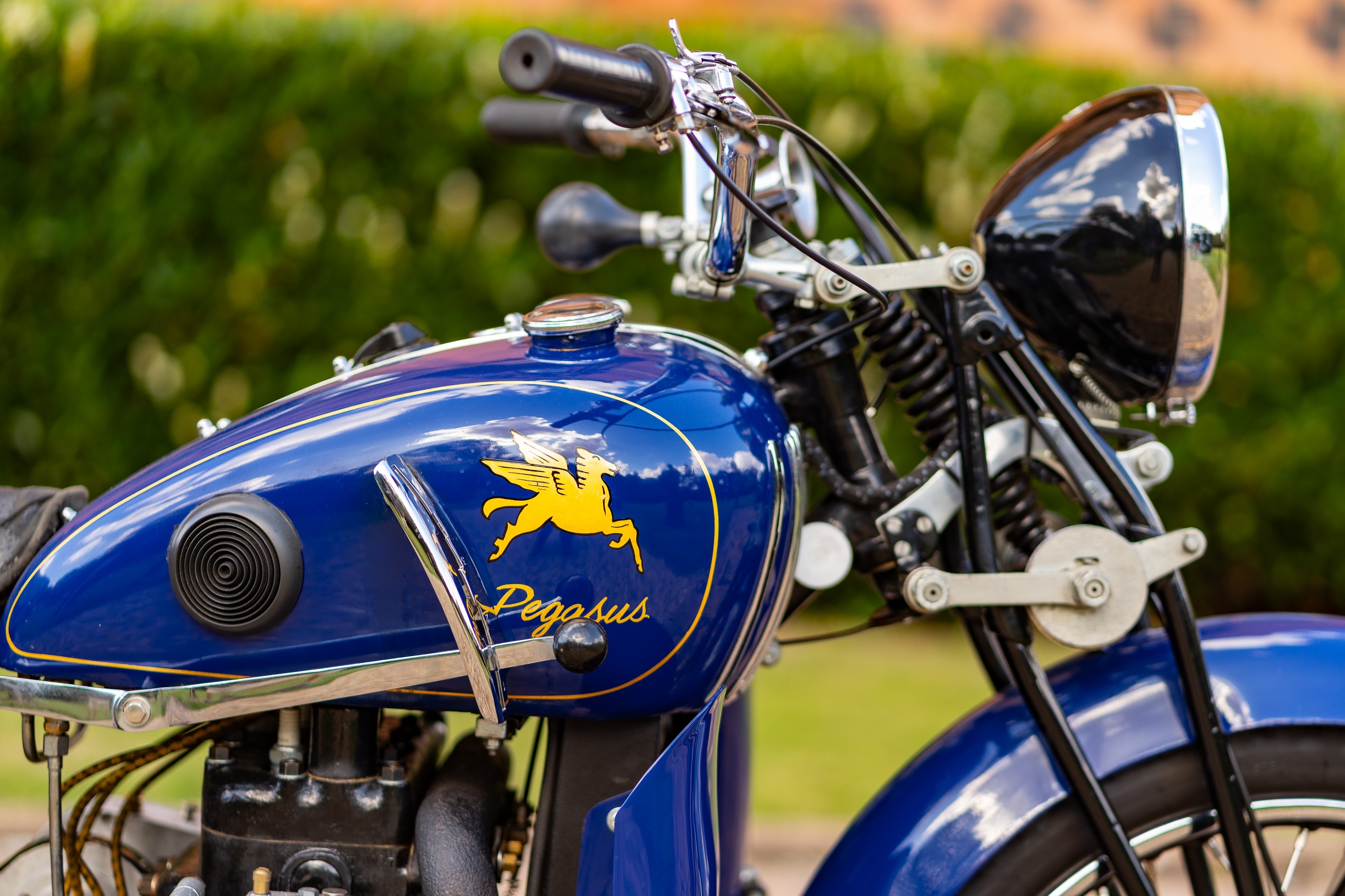 But if the concept of using an Austin Seven “peoples’ car” engine was good enough for George Brough, then it’s no surprise it appealed to others too, with this example we see before us one of the better ones. So what have we here? Badged as “Pegasus,” it’s a 1928 Panther – P&M/Phelon and Moore – frame and such, with the single-cylinder engine removed and in its place the Austin Seven car engine; which was, incidentally, lighter than an Ariel Square Four unit.